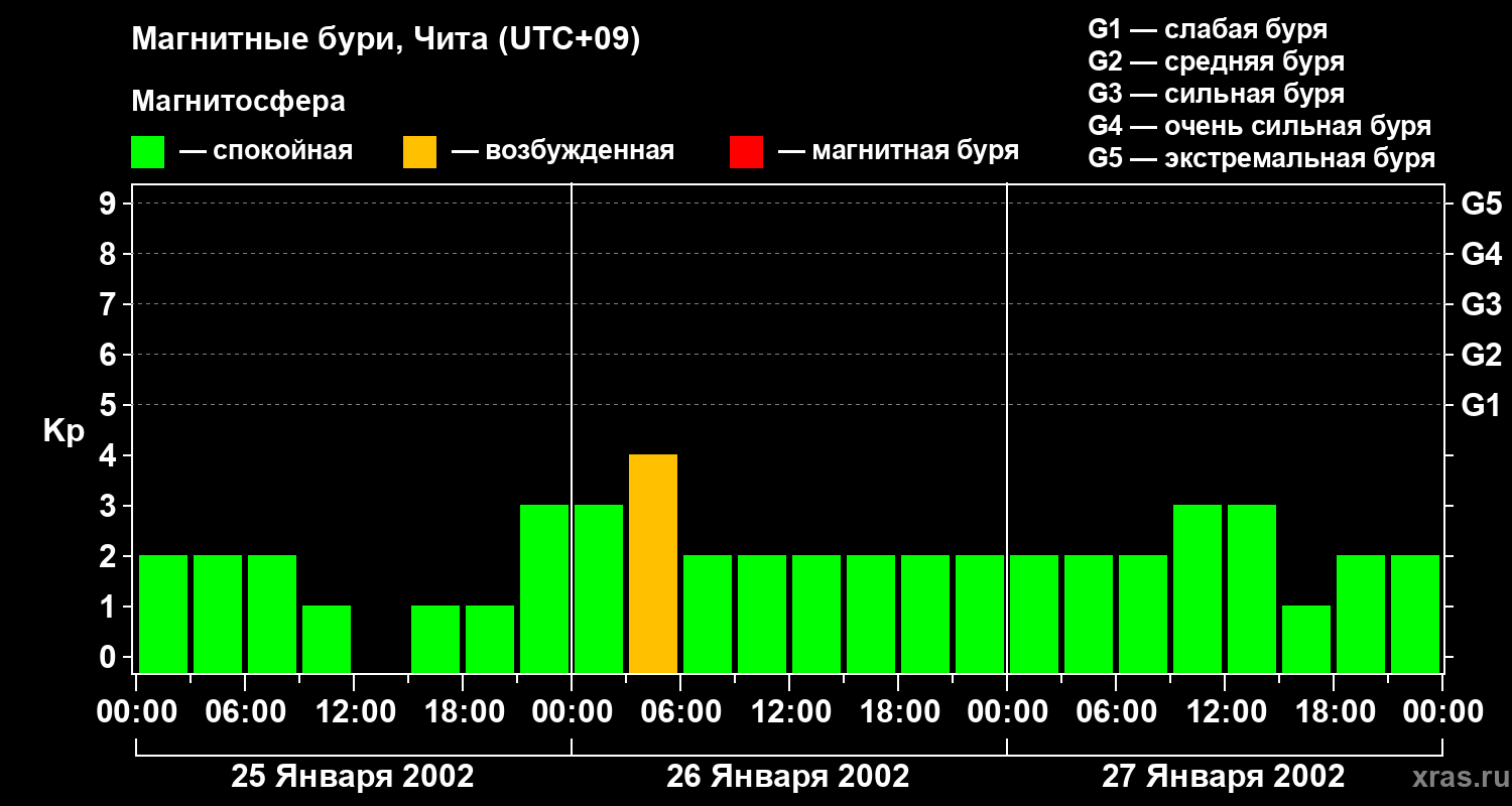 Изменения геомагнитного индекса Kp с 25 по 27 января 2002 года для средних широт