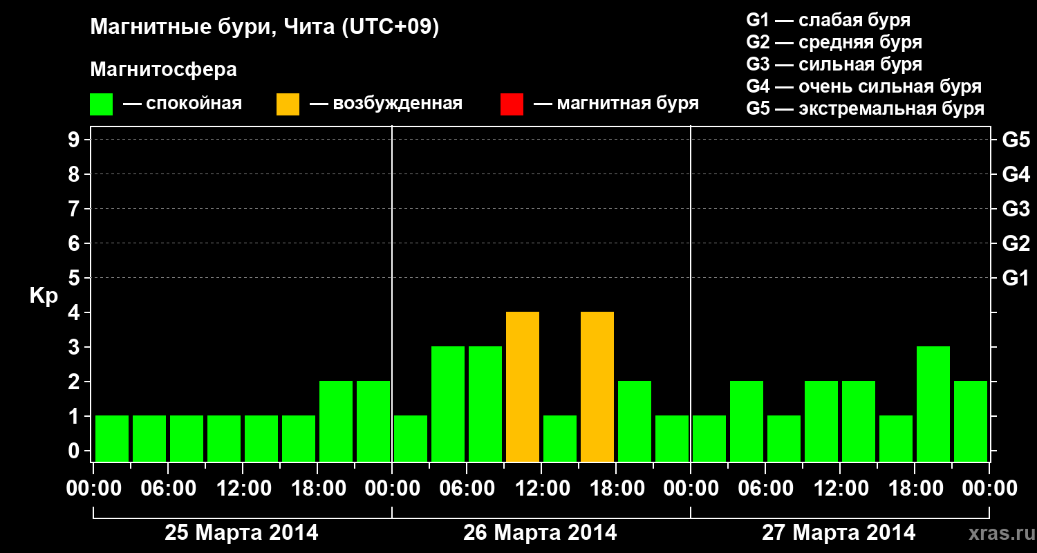Изменения геомагнитного индекса Kp с 25 по 27 марта 2014 года для средних широт