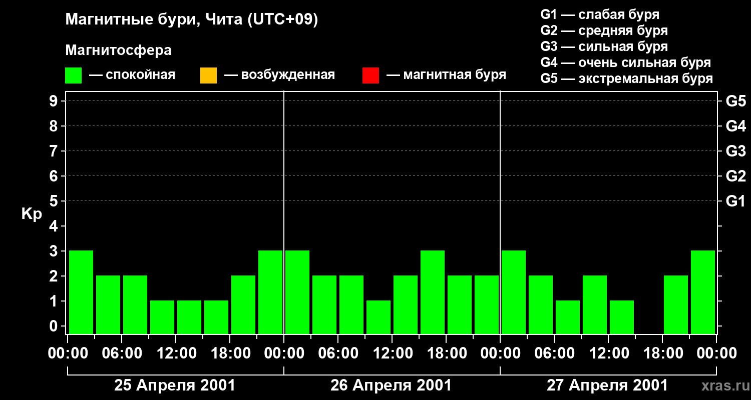 Изменения геомагнитного индекса Kp с 25 по 27 апреля 2001 года для средних широт