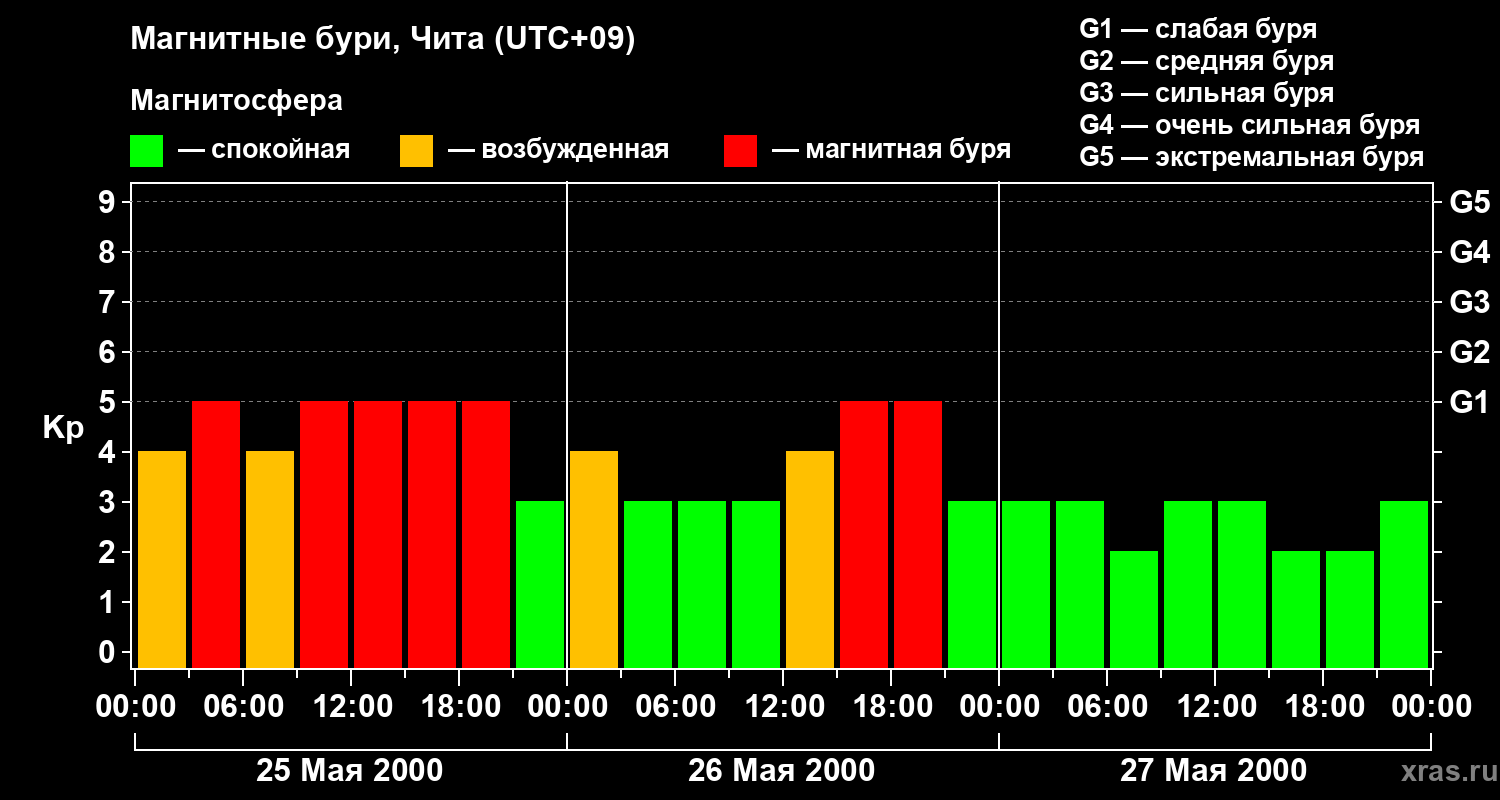 Изменения геомагнитного индекса Kp с 25 по 27 мая 2000 года для средних широт