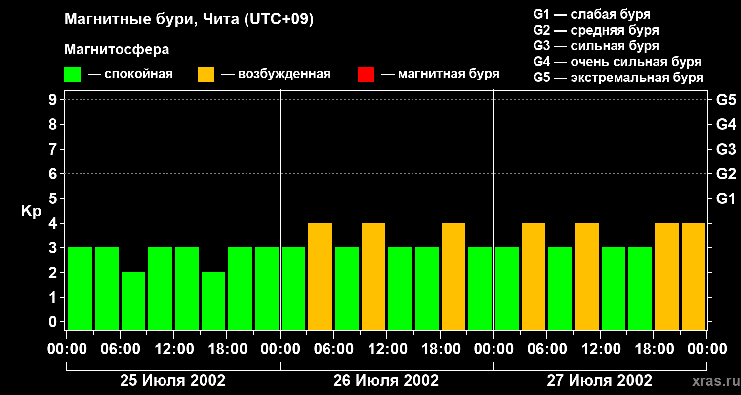 Изменения геомагнитного индекса Kp с 25 по 27 июля 2002 года для средних широт