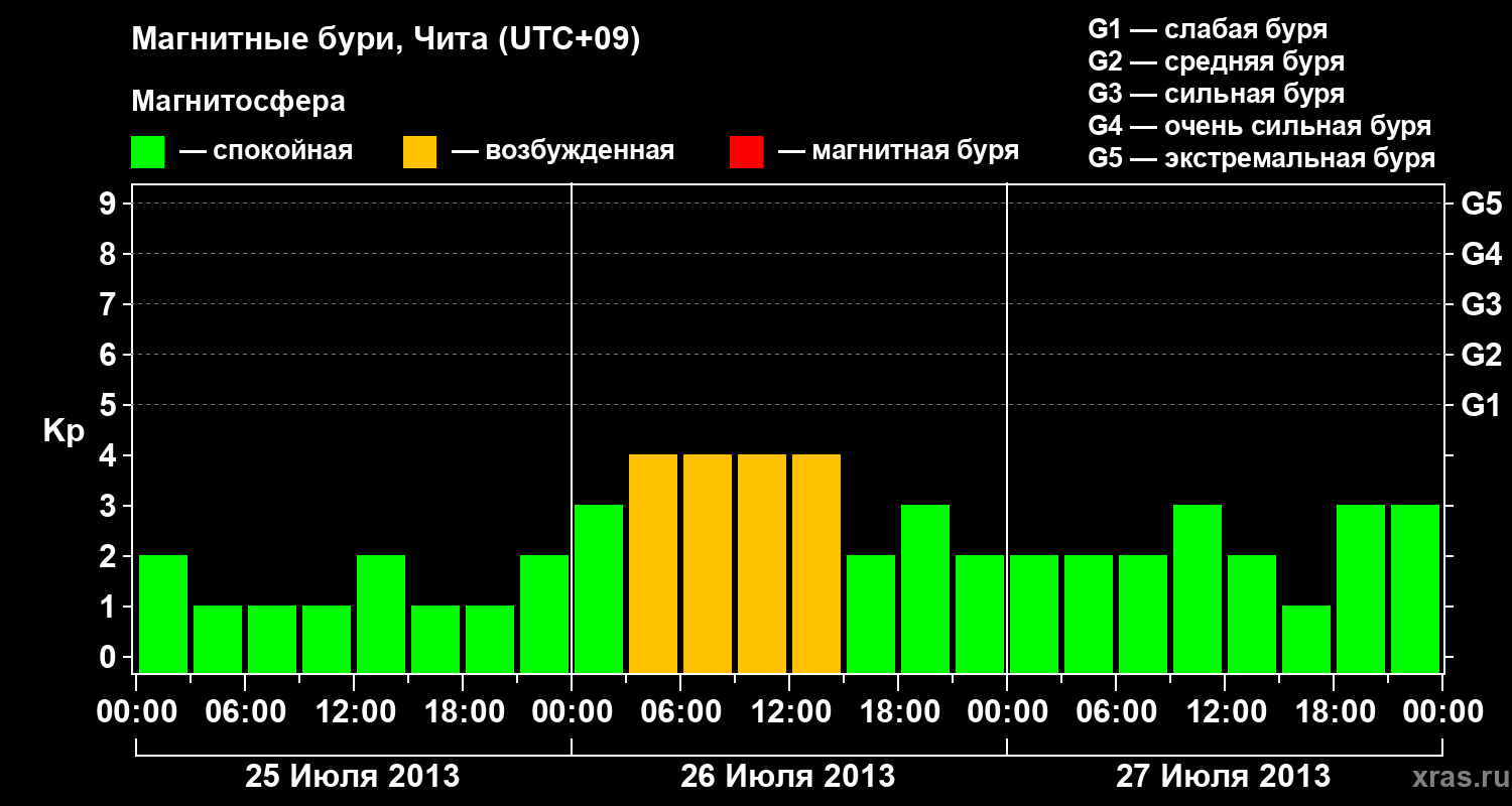 Изменения геомагнитного индекса Kp с 25 по 27 июля 2013 года для средних широт