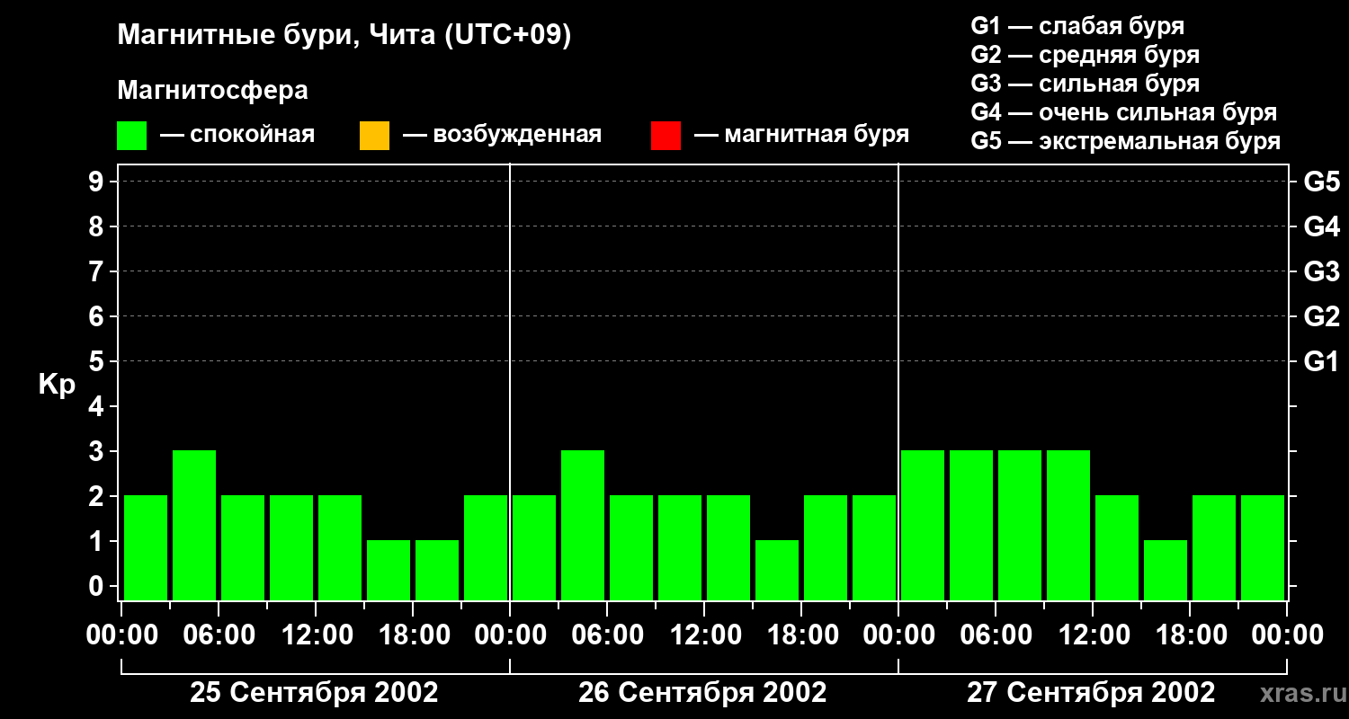Изменения геомагнитного индекса Kp с 25 по 27 сентября 2002 года для средних широт