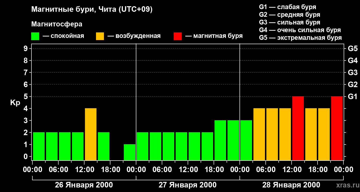 Изменения геомагнитного индекса Kp с 26 по 28 января 2000 года для средних широт