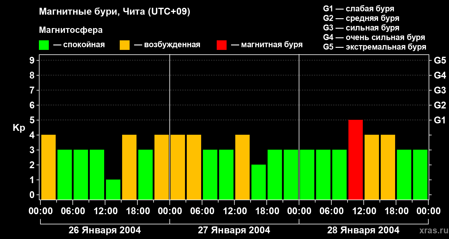 Изменения геомагнитного индекса Kp с 26 по 28 января 2004 года для средних широт