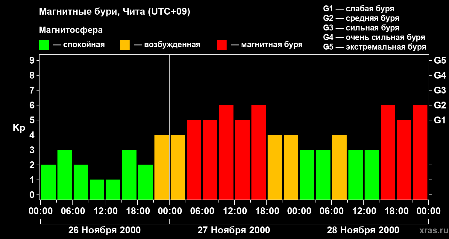 Изменения геомагнитного индекса Kp с 26 по 28 ноября 2000 года для средних широт