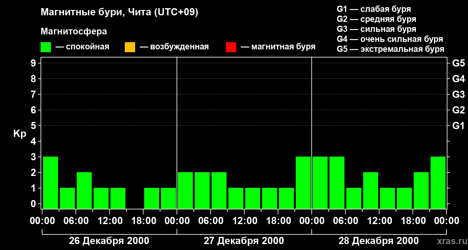 Изменения геомагнитного индекса Kp с 26 по 28 декабря 2000 года для средних широт