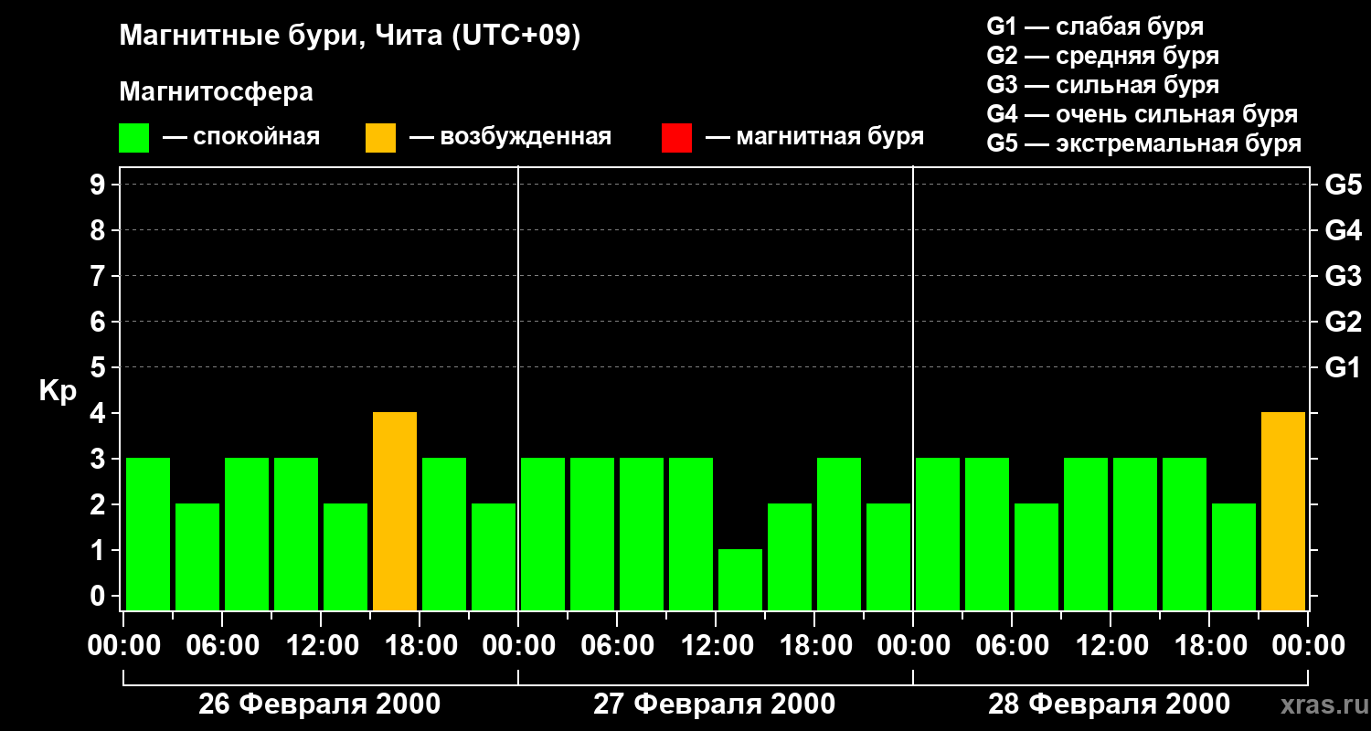 Изменения геомагнитного индекса Kp с 26 по 28 февраля 2000 года для средних широт