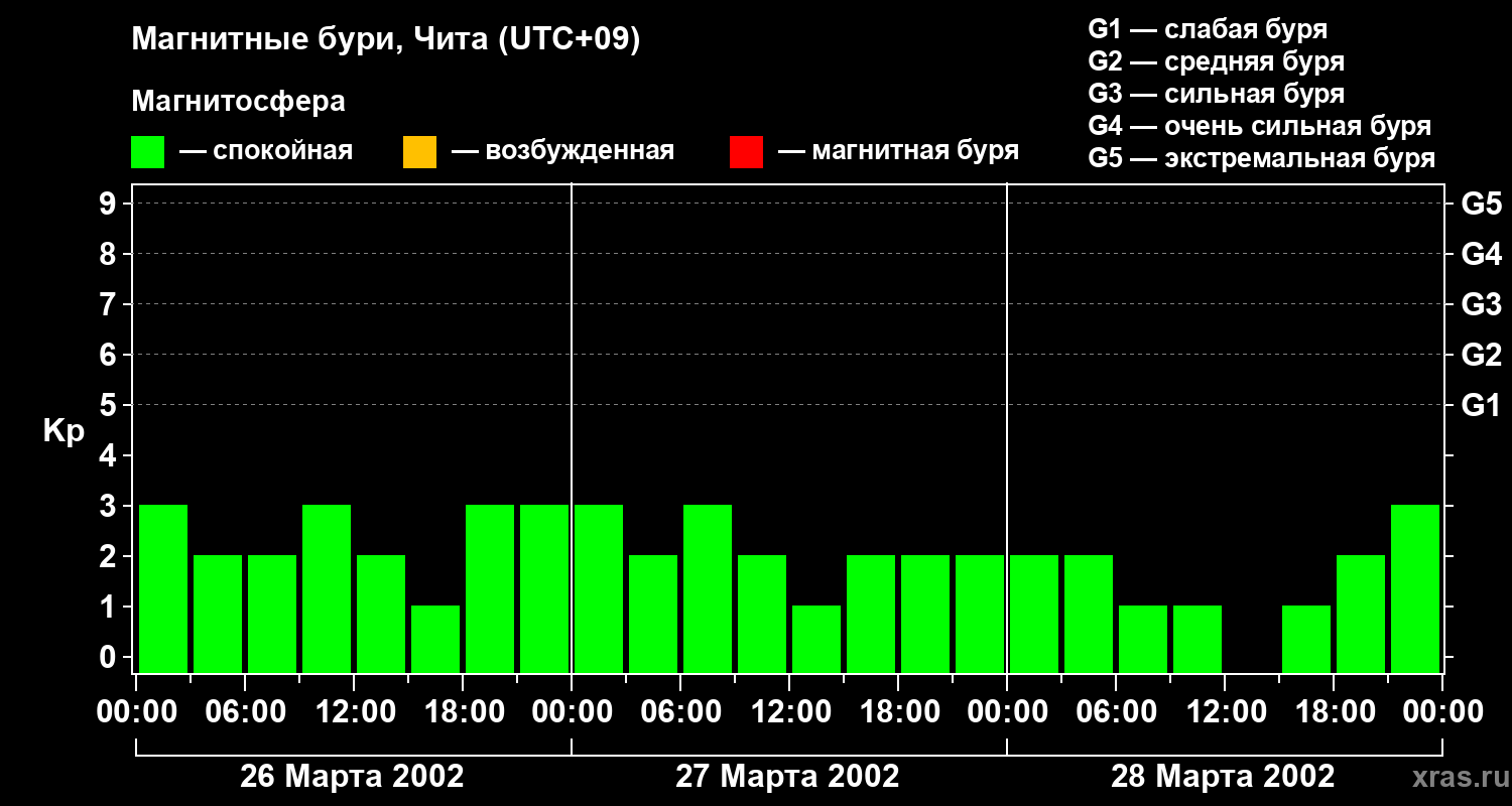 Изменения геомагнитного индекса Kp с 26 по 28 марта 2002 года для средних широт