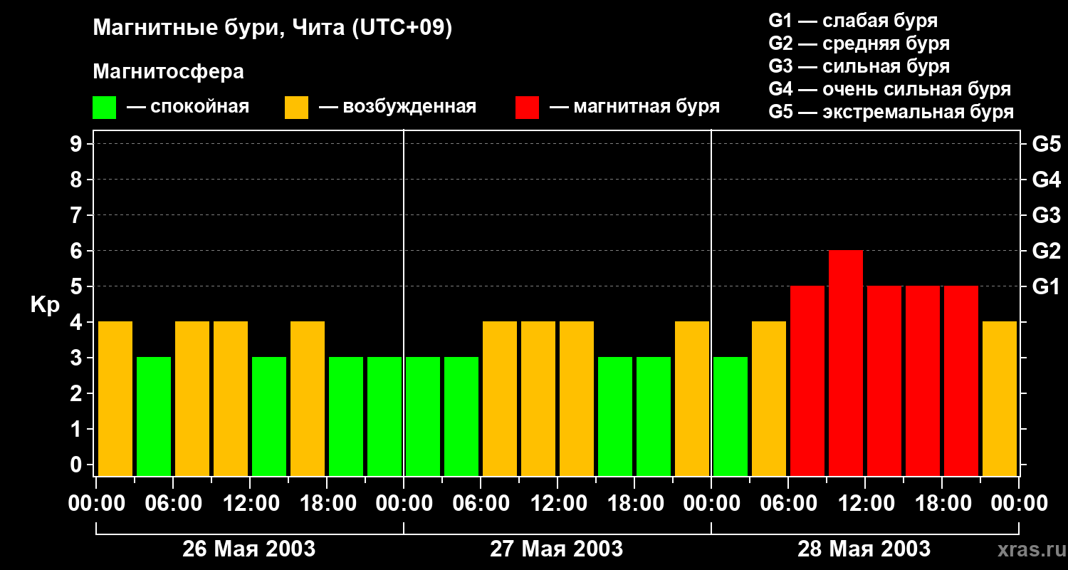 Изменения геомагнитного индекса Kp с 26 по 28 мая 2003 года для средних широт