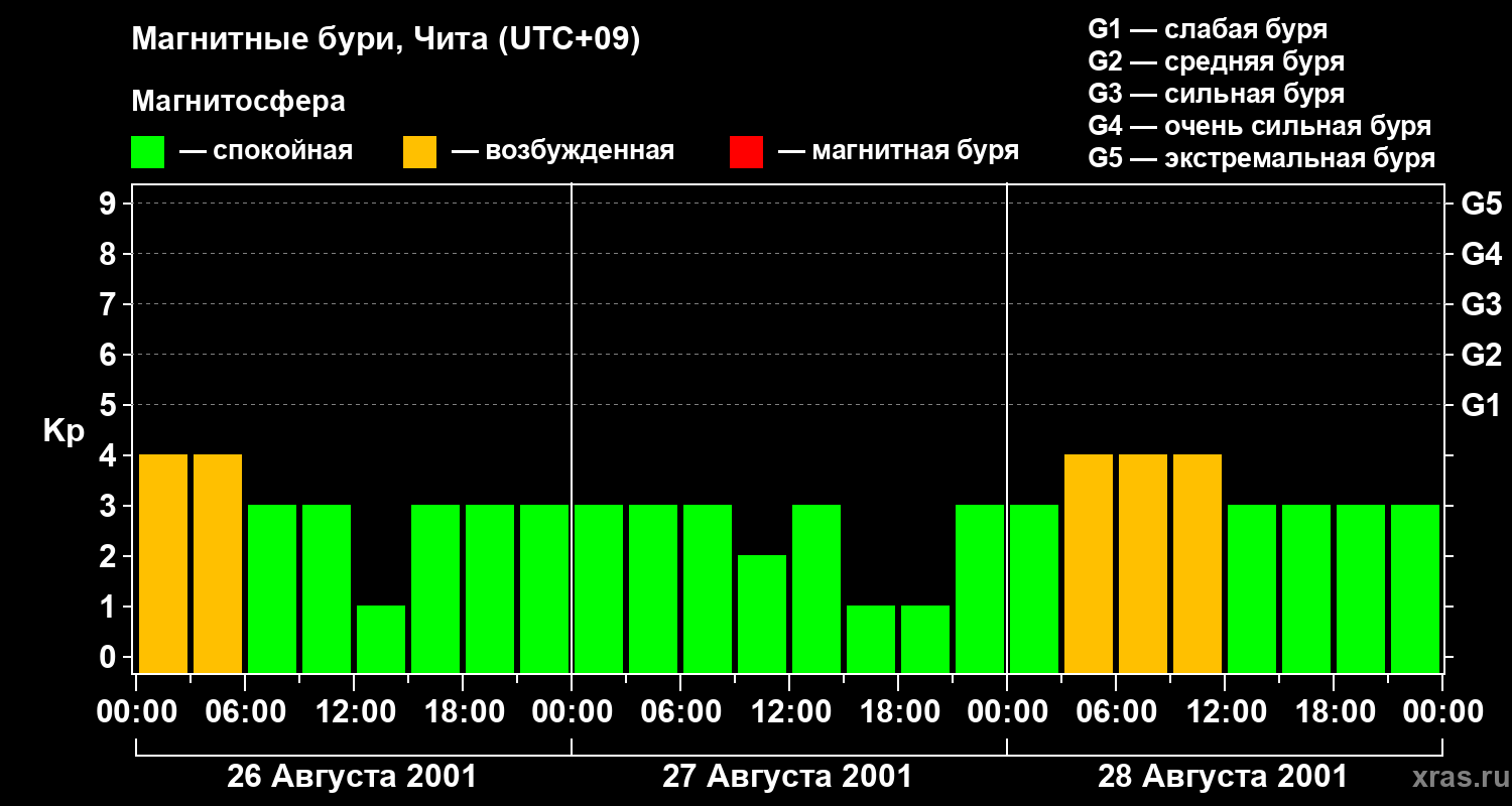 Изменения геомагнитного индекса Kp с 26 по 28 августа 2001 года для средних широт