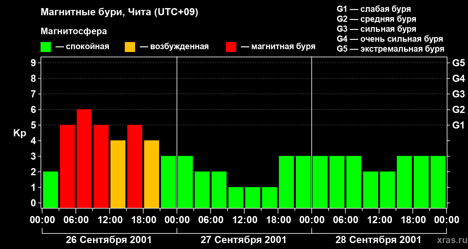 Изменения геомагнитного индекса Kp с 26 по 28 сентября 2001 года для средних широт