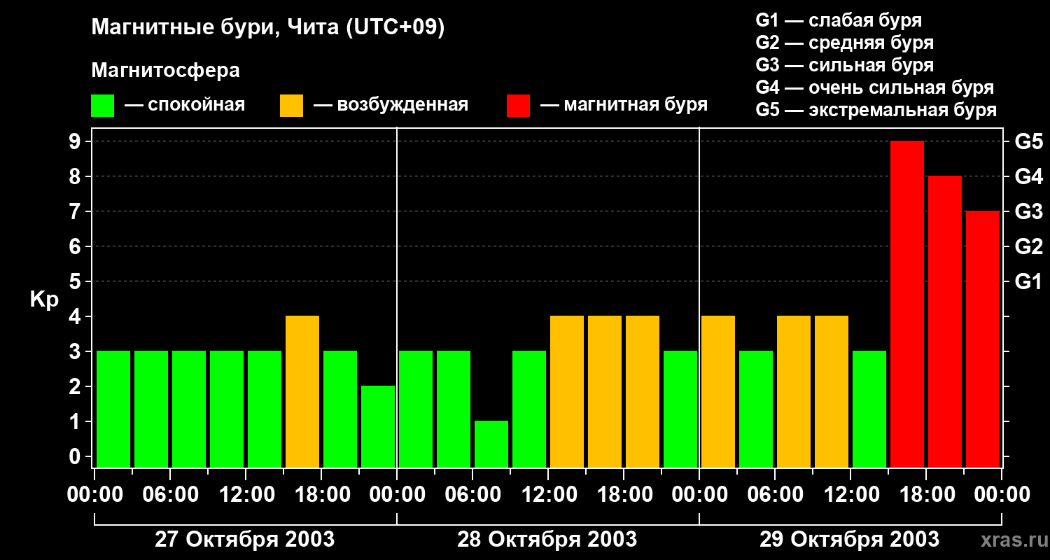 Изменения геомагнитного индекса Kp с 27 по 29 октября 2003 года для средних широт