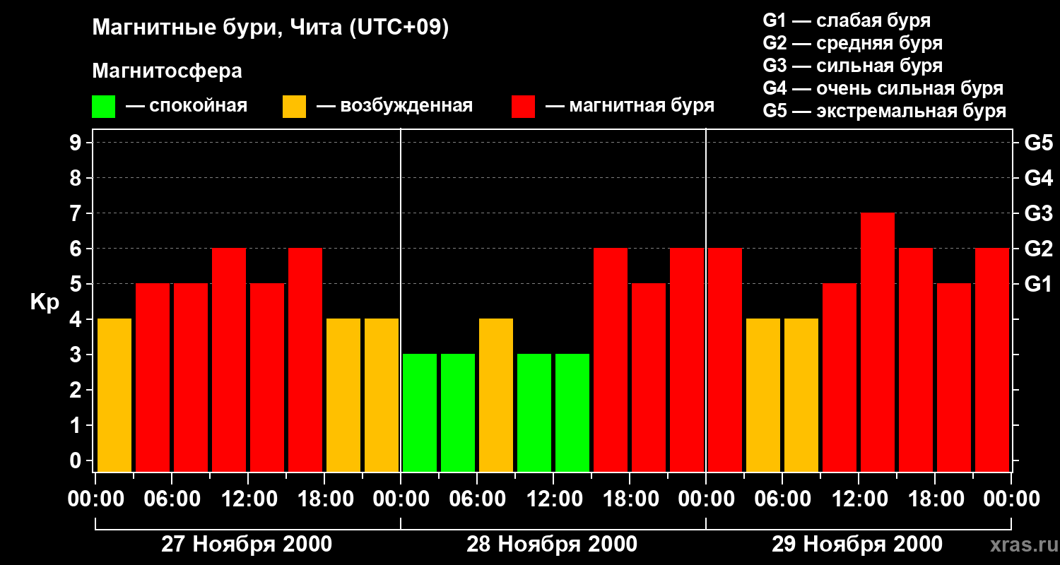 Изменения геомагнитного индекса Kp с 27 по 29 ноября 2000 года для средних широт