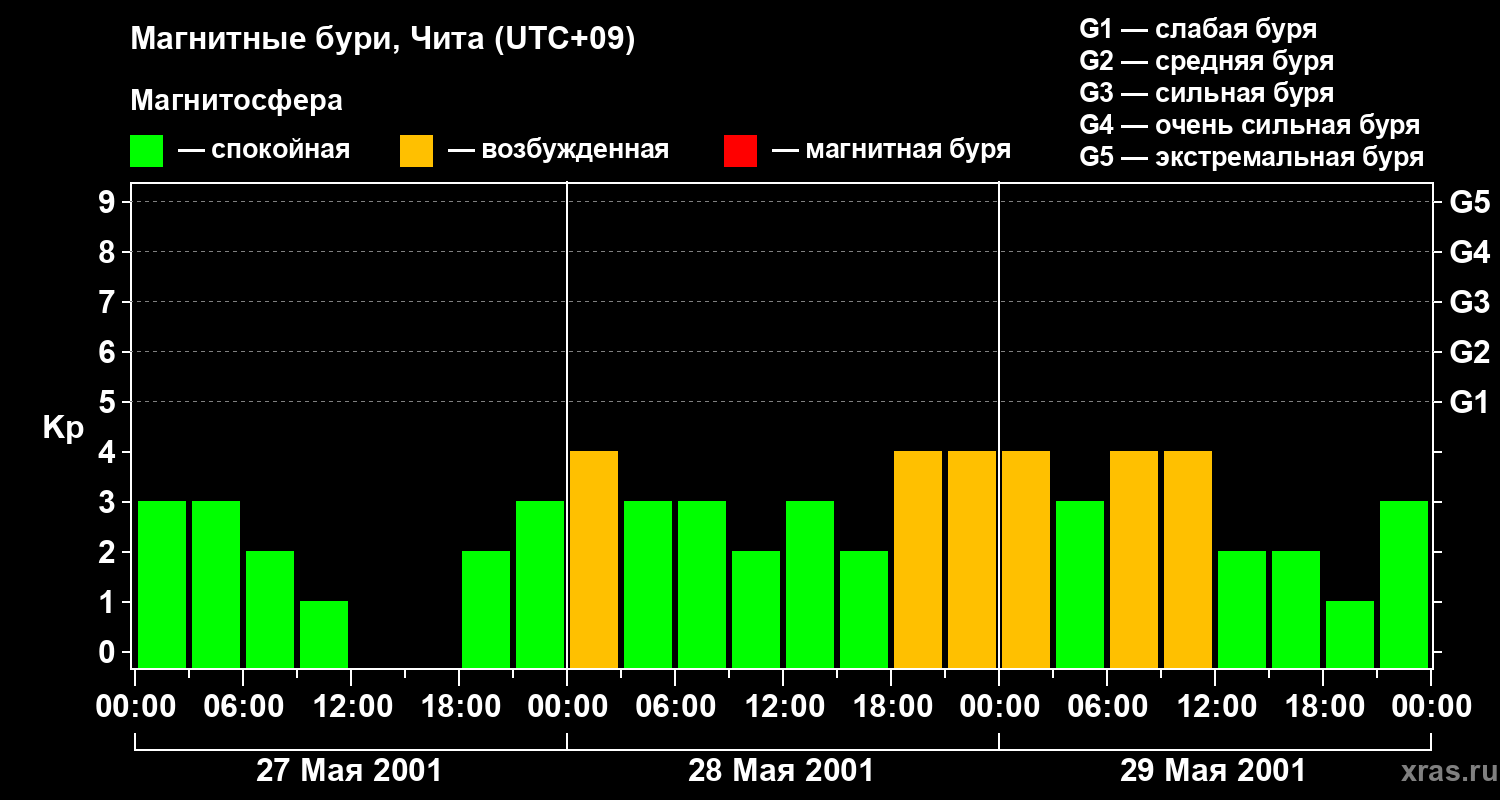 Изменения геомагнитного индекса Kp с 27 по 29 мая 2001 года для средних широт
