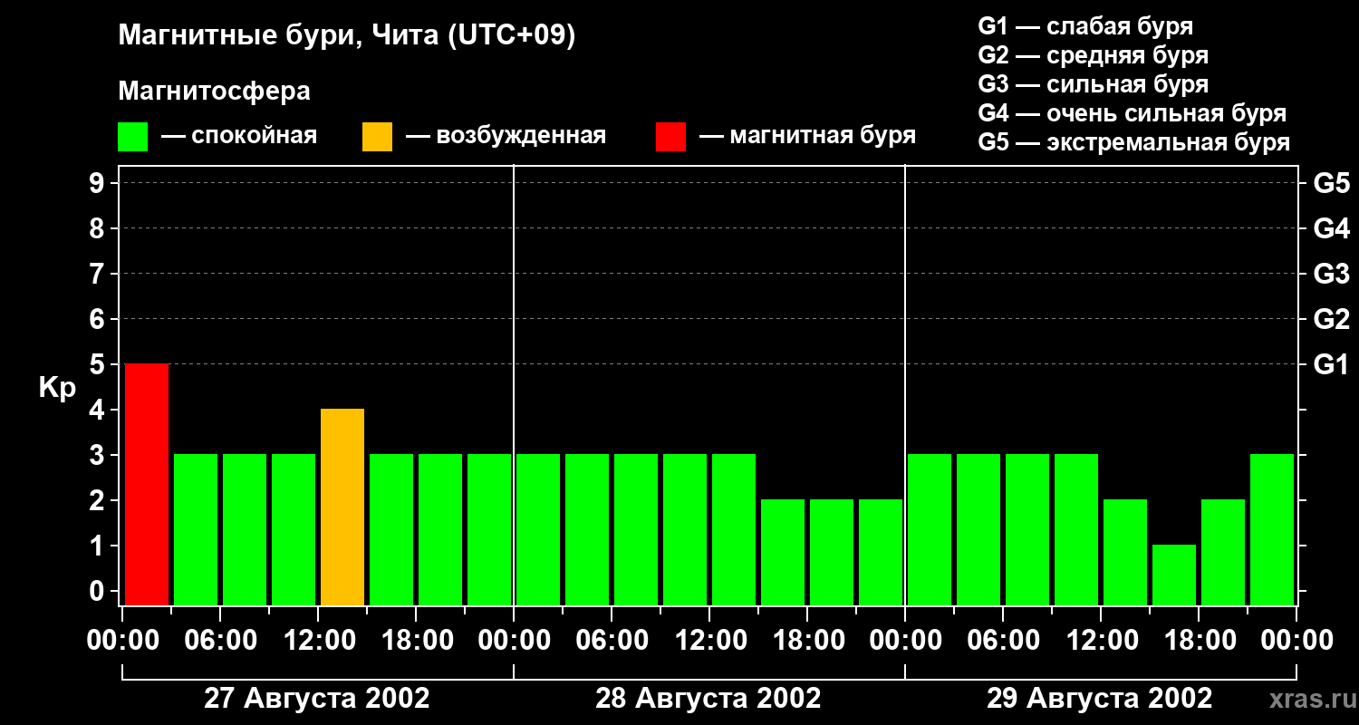 Изменения геомагнитного индекса Kp с 27 по 29 августа 2002 года для средних широт