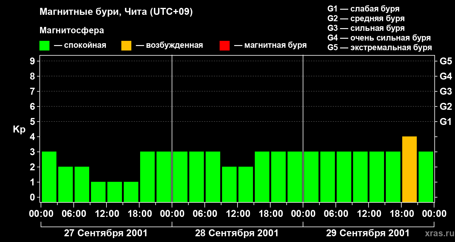 Изменения геомагнитного индекса Kp с 27 по 29 сентября 2001 года для средних широт