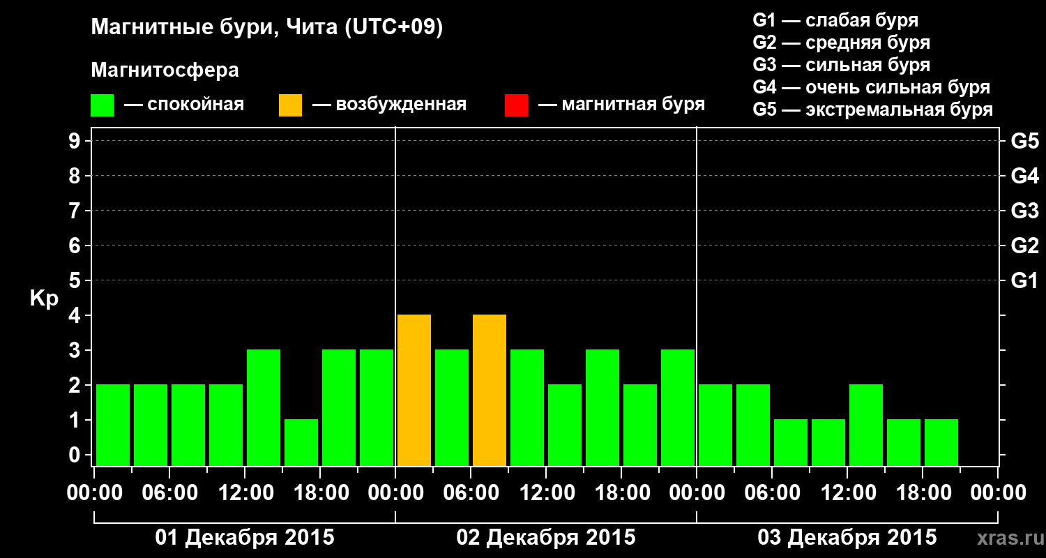 Изменения геомагнитного индекса Kp с 1 по 3 декабря 2015 года для средних широт