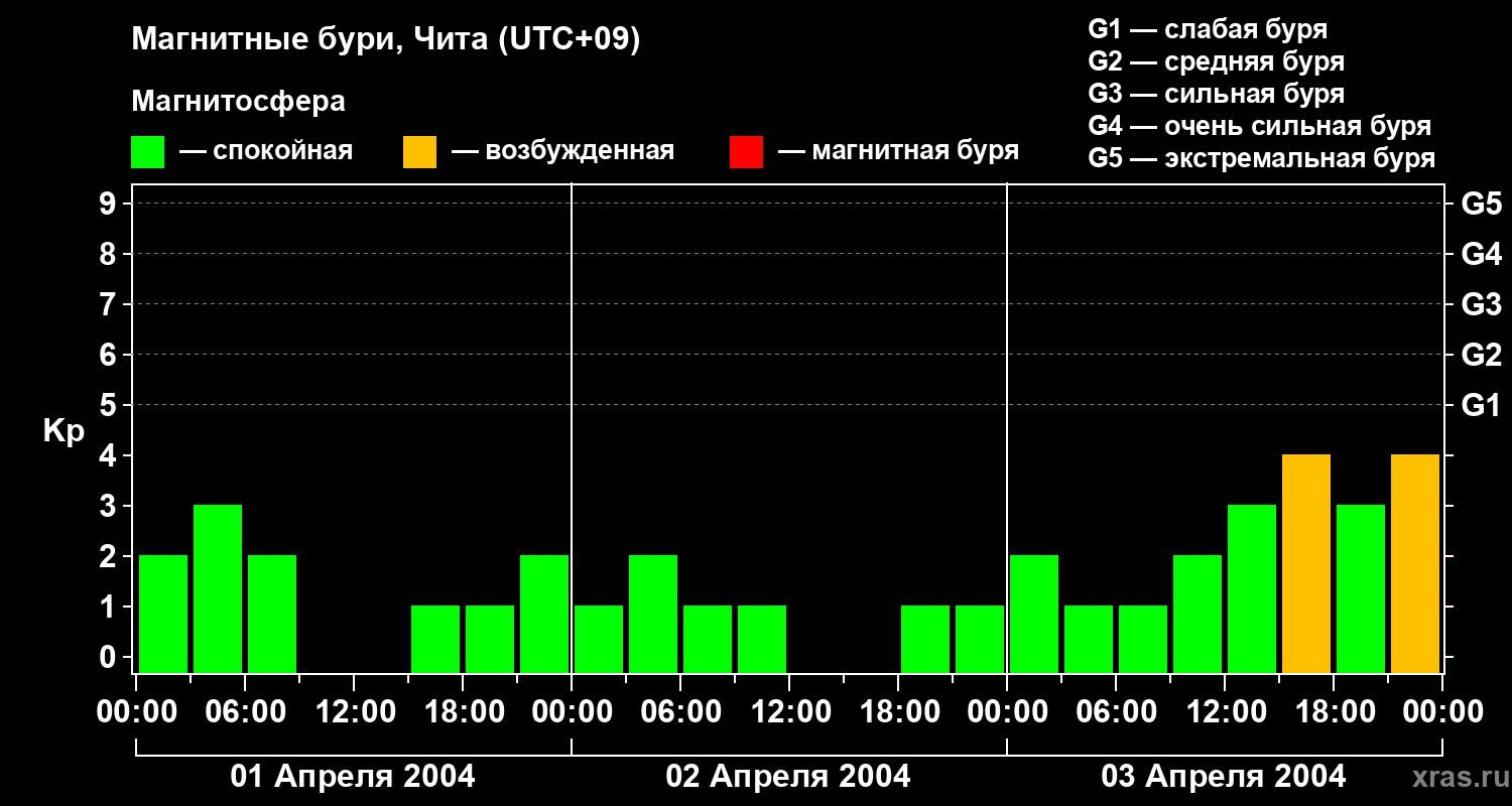 Изменения геомагнитного индекса Kp с 1 по 3 апреля 2004 года для средних широт