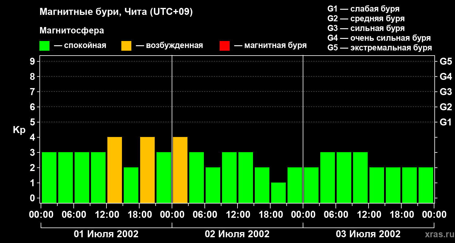 Изменения геомагнитного индекса Kp с 1 по 3 июля 2002 года для средних широт