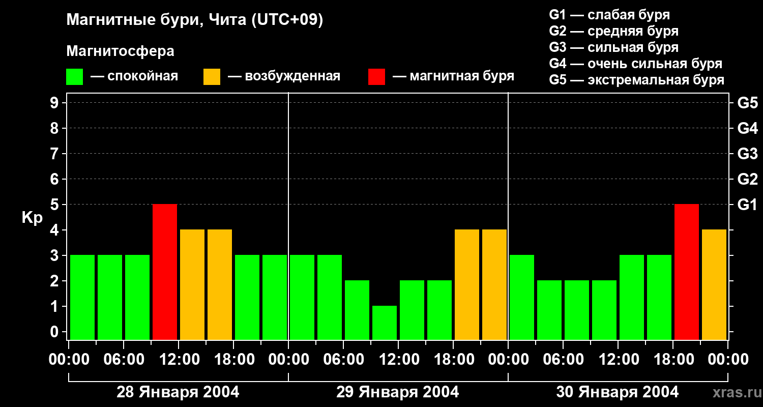 Изменения геомагнитного индекса Kp с 28 по 30 января 2004 года для средних широт