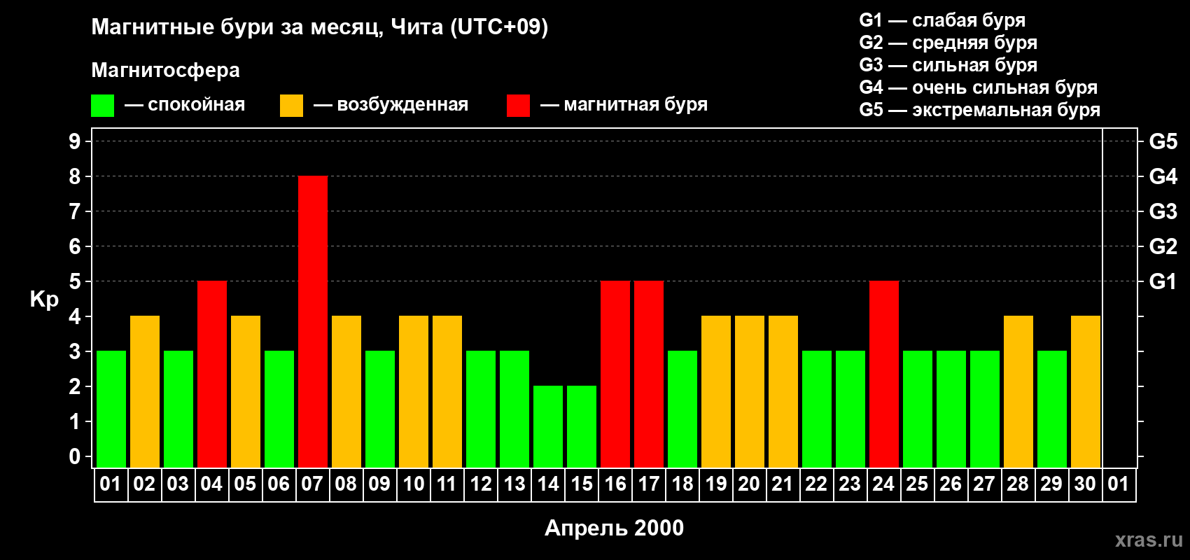 Изменения максимального суточного геомагнитного индекса Kp в апреле 2000 года для средних широт