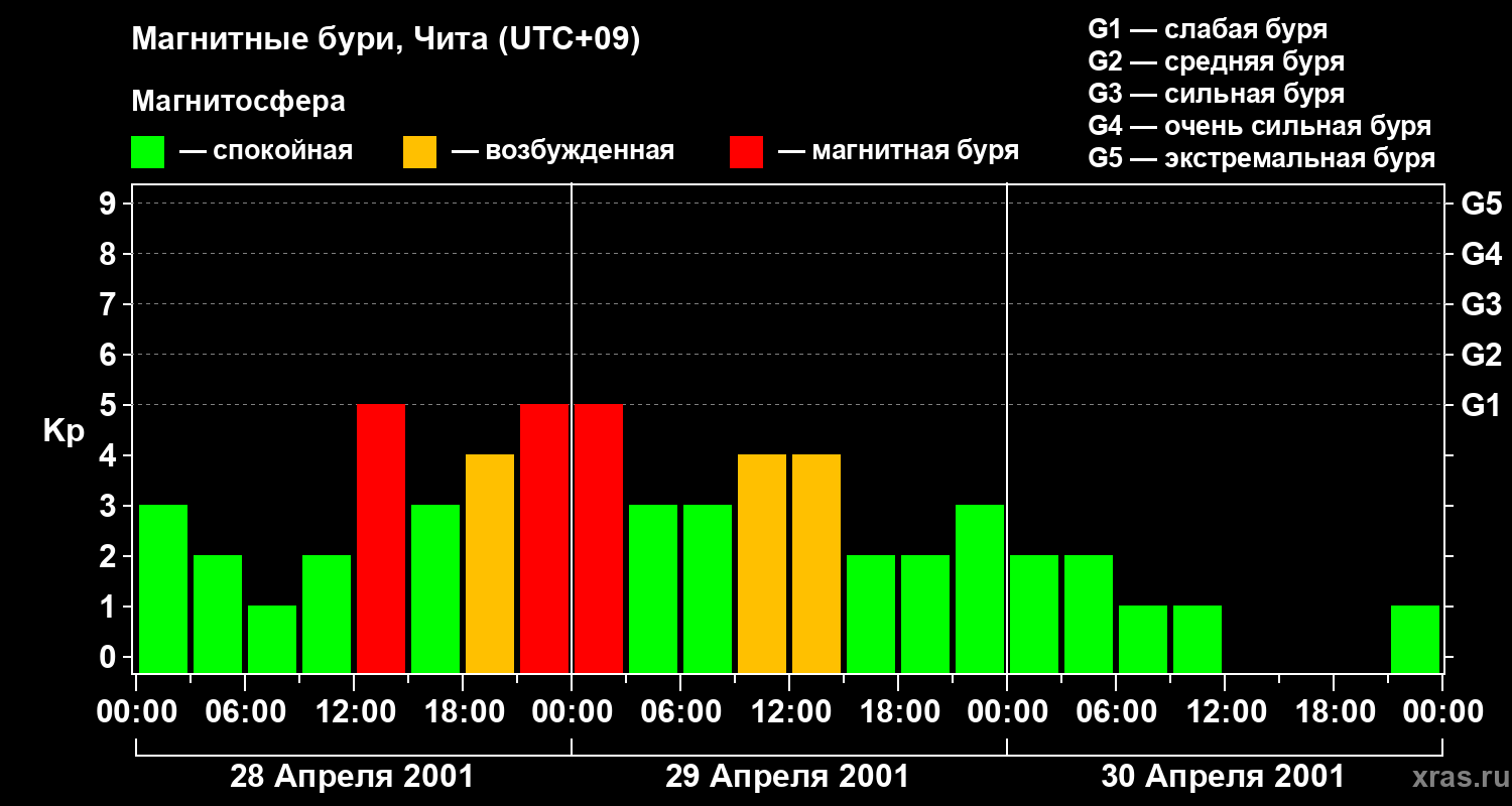 Изменения геомагнитного индекса Kp с 28 по 30 апреля 2001 года для средних широт