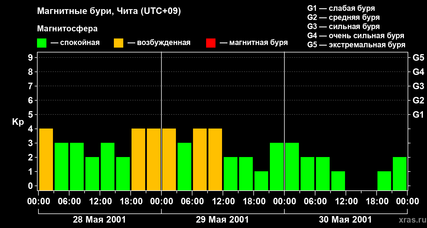 Изменения геомагнитного индекса Kp с 28 по 30 мая 2001 года для средних широт