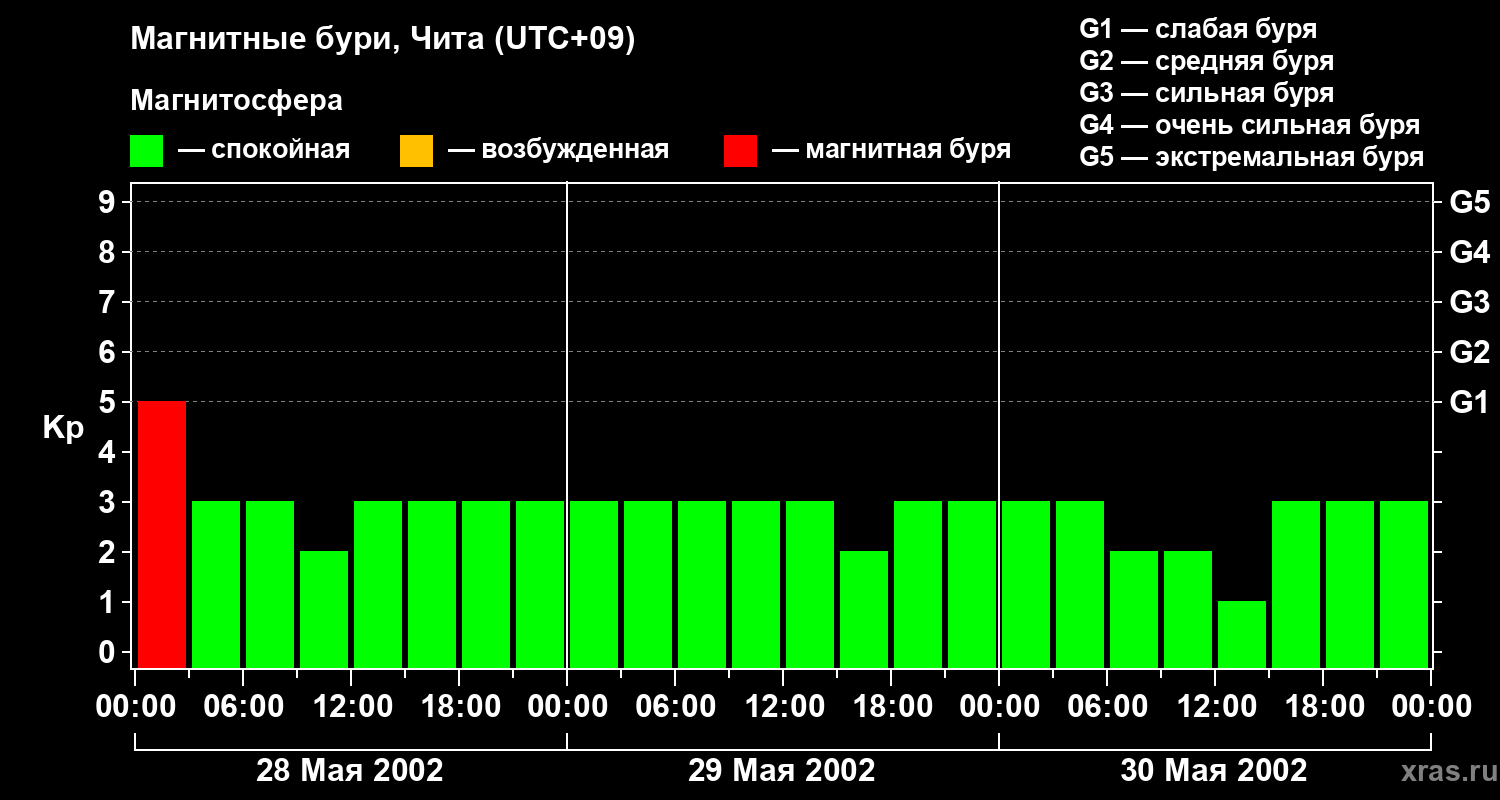 Изменения геомагнитного индекса Kp с 28 по 30 мая 2002 года для средних широт