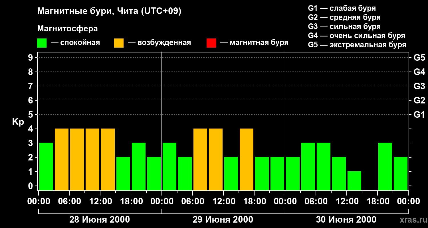 Изменения геомагнитного индекса Kp с 28 по 30 июня 2000 года для средних широт