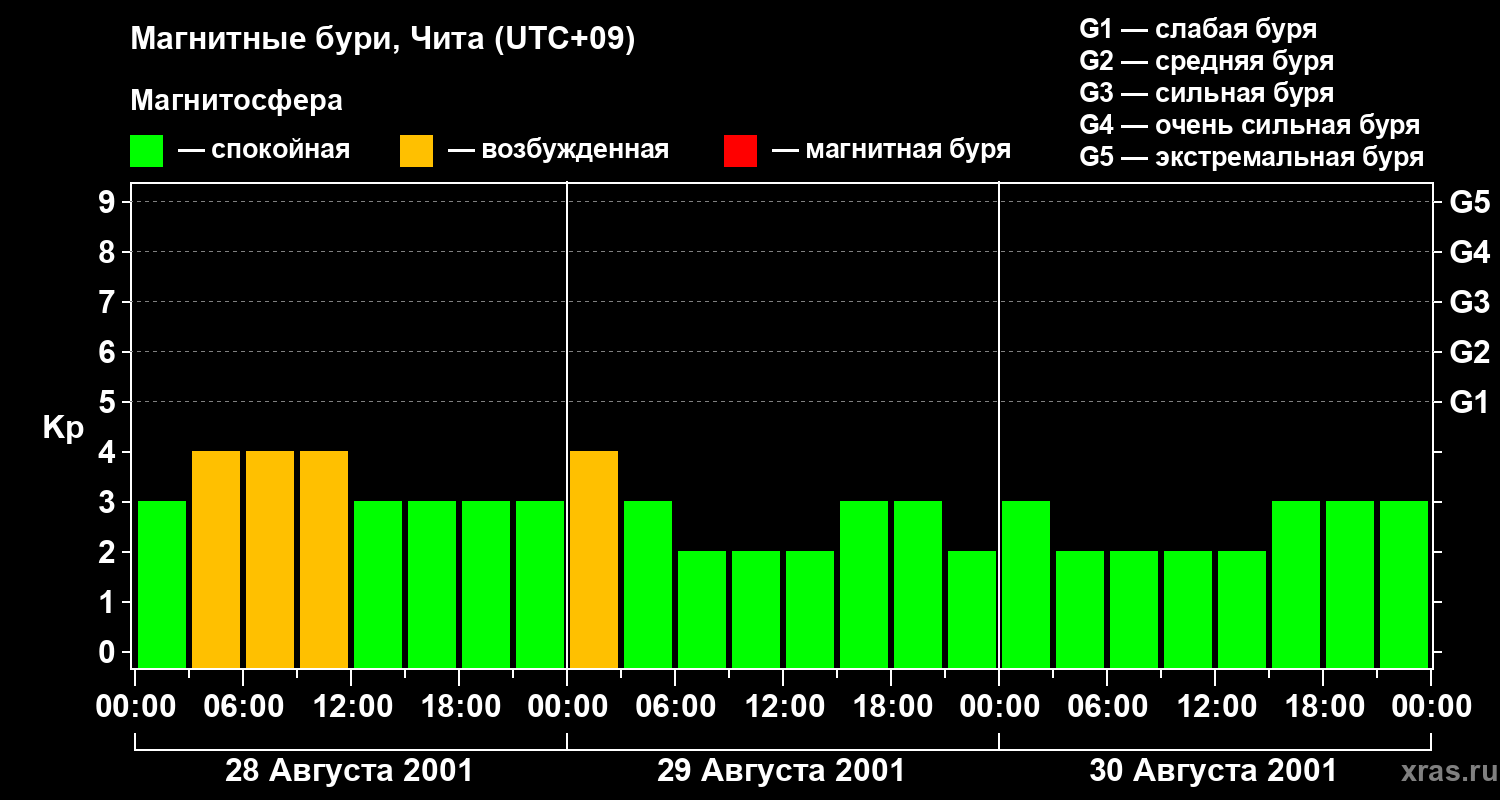 Изменения геомагнитного индекса Kp с 28 по 30 августа 2001 года для средних широт
