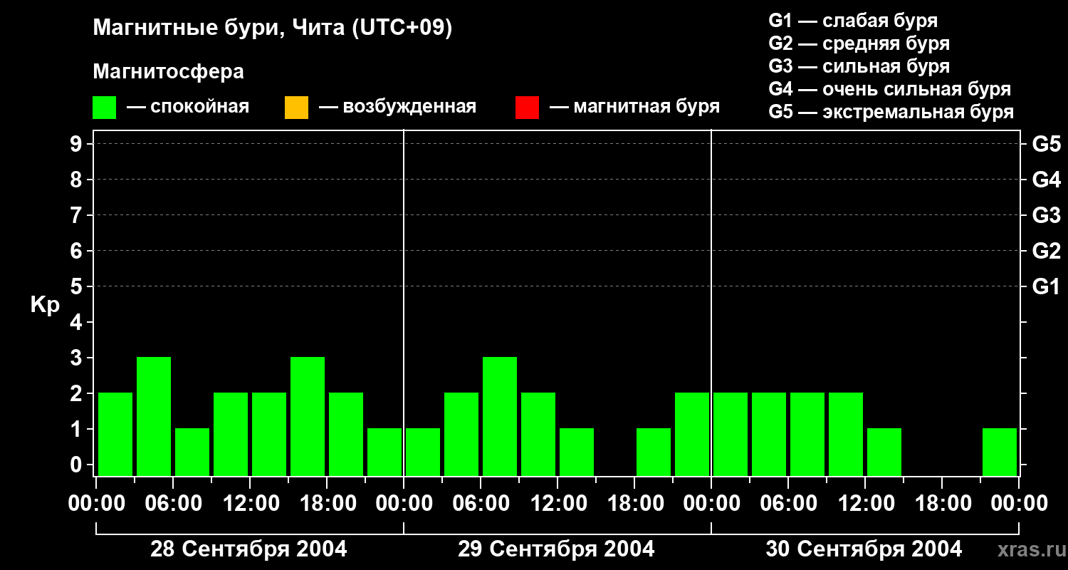 Изменения геомагнитного индекса Kp с 28 по 30 сентября 2004 года для средних широт