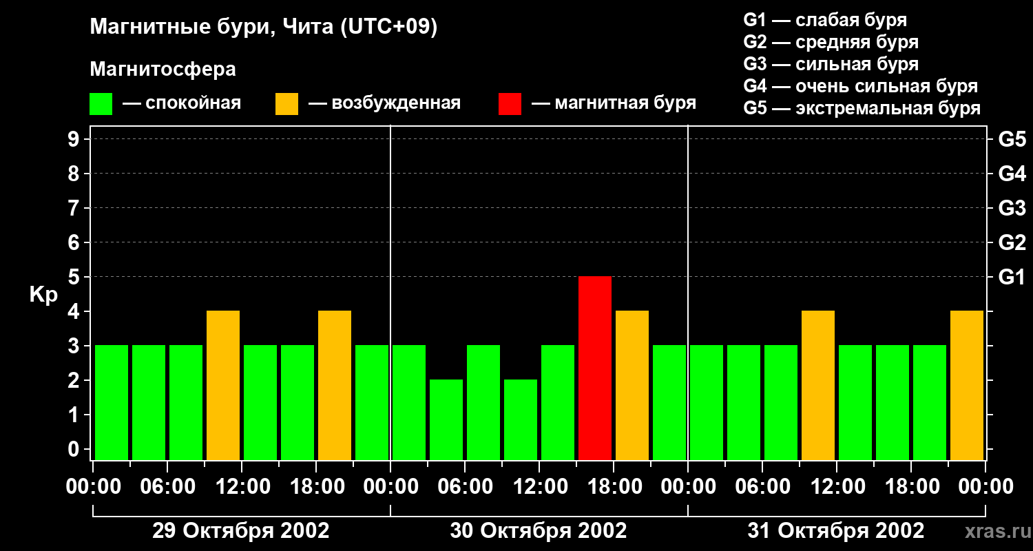 Изменения геомагнитного индекса Kp с 29 по 31 октября 2002 года для средних широт
