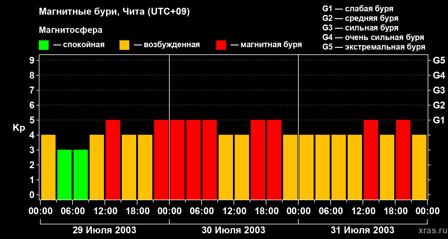 Изменения геомагнитного индекса Kp с 29 по 31 июля 2003 года для средних широт
