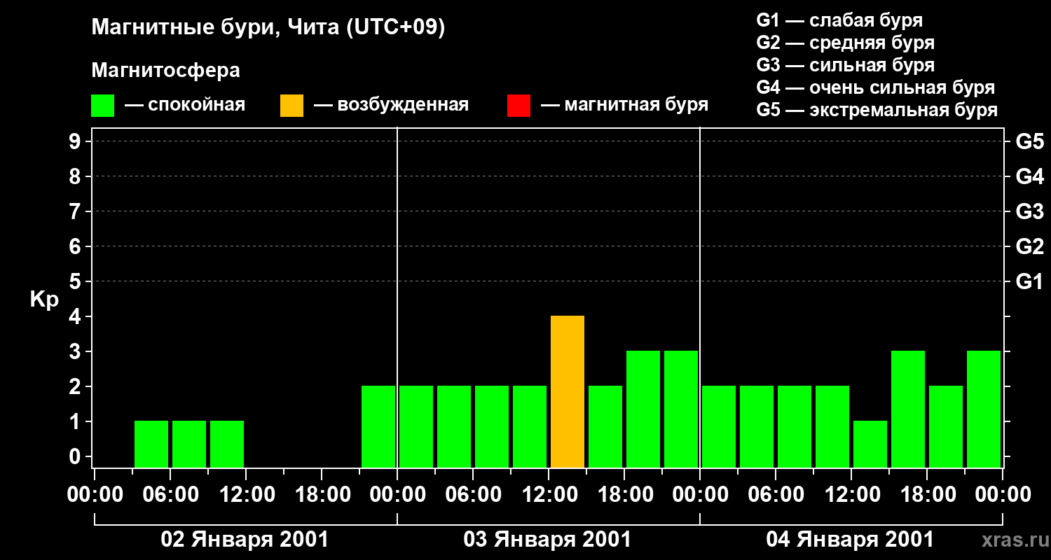 Изменения геомагнитного индекса Kp с 2 по 4 января 2001 года для средних широт