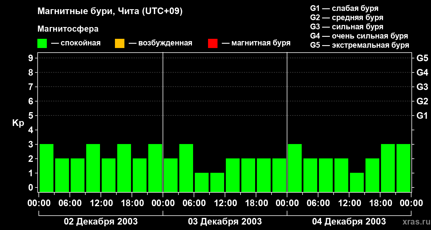 Изменения геомагнитного индекса Kp с 2 по 4 декабря 2003 года для средних широт