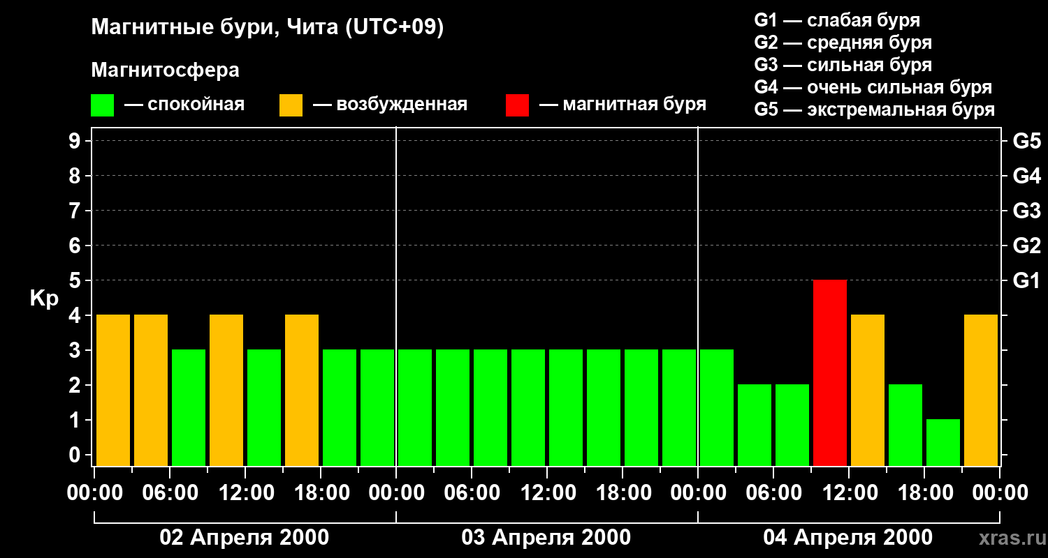 Изменения геомагнитного индекса Kp с 2 по 4 апреля 2000 года для средних широт