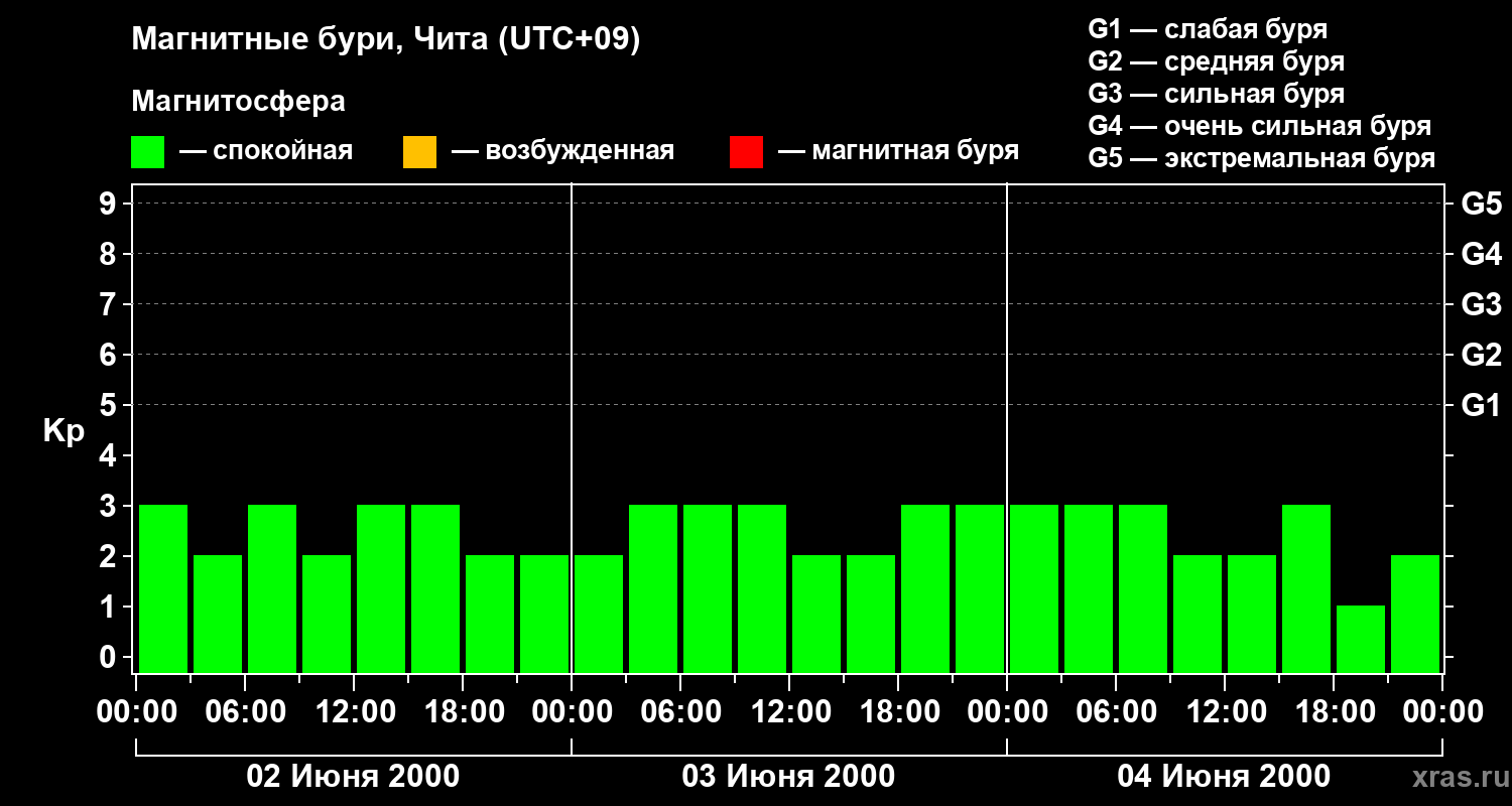 Изменения геомагнитного индекса Kp с 2 по 4 июня 2000 года для средних широт