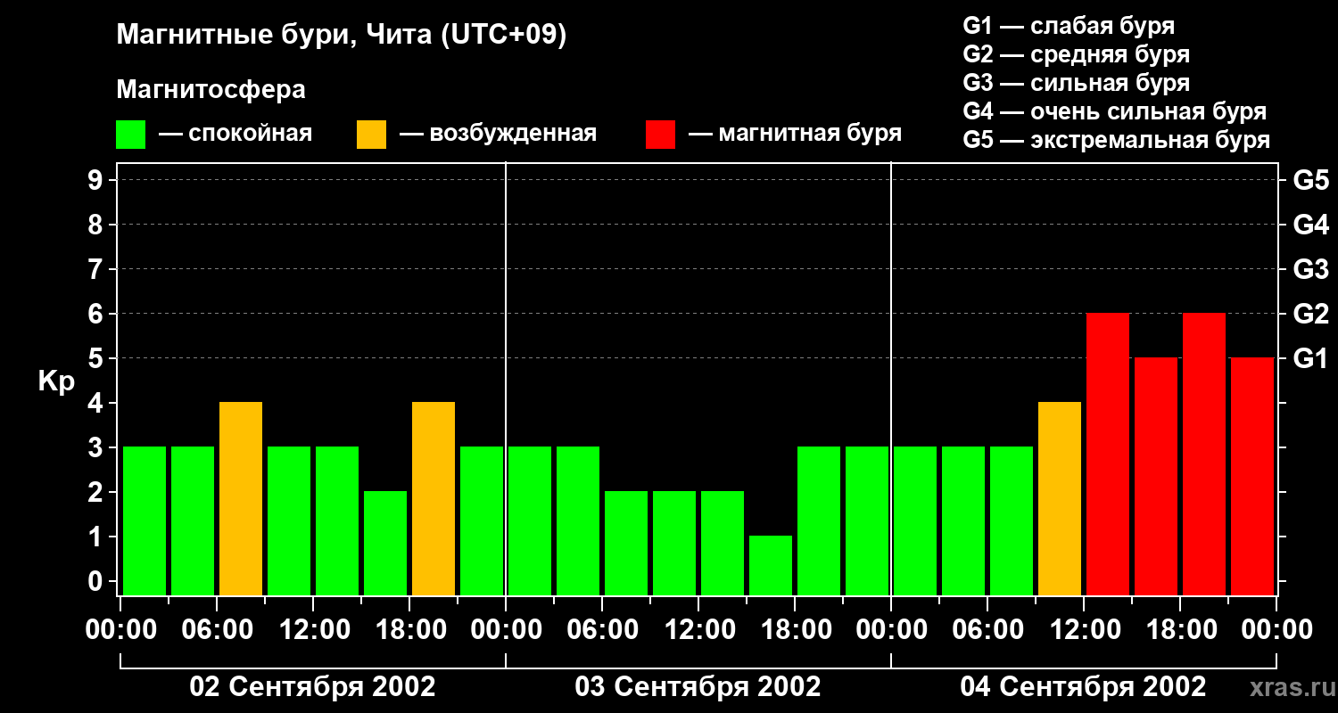 Изменения геомагнитного индекса Kp с 2 по 4 сентября 2002 года для средних широт