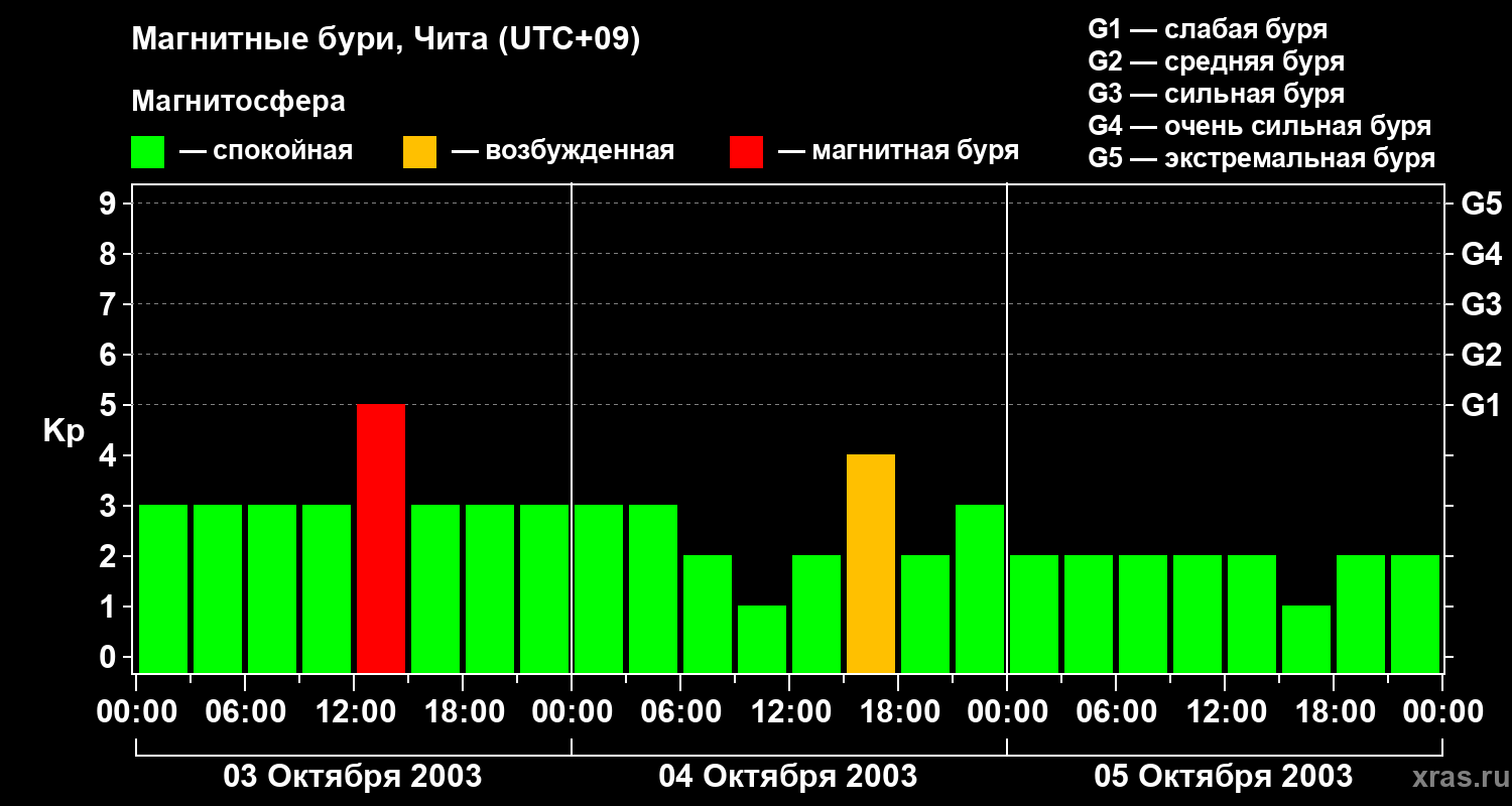 Изменения геомагнитного индекса Kp с 3 по 5 октября 2003 года для средних широт