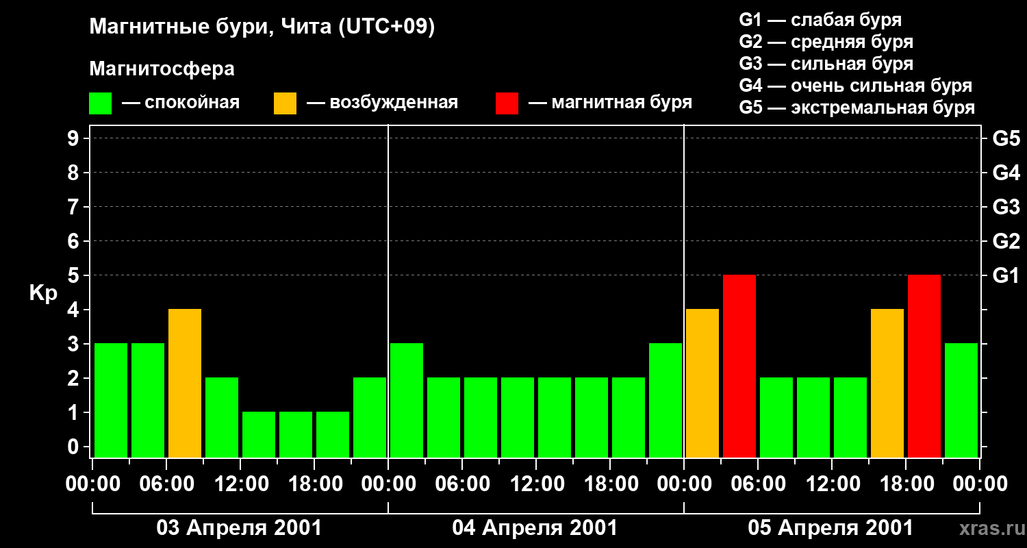 Изменения геомагнитного индекса Kp с 3 по 5 апреля 2001 года для средних широт