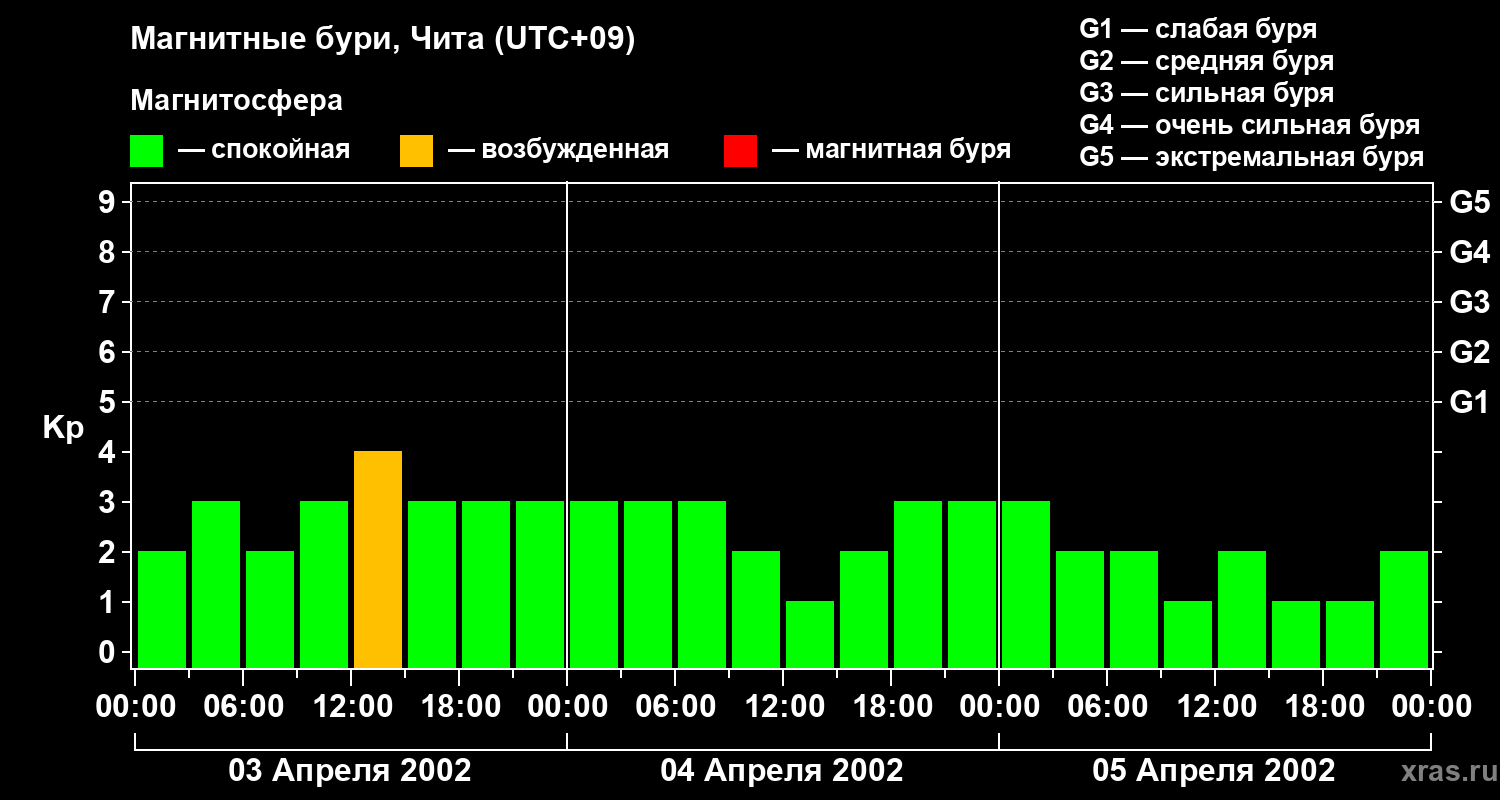 Изменения геомагнитного индекса Kp с 3 по 5 апреля 2002 года для средних широт