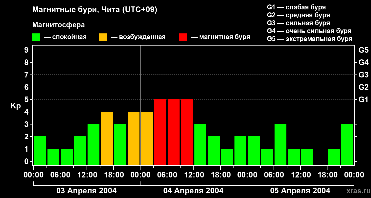 Изменения геомагнитного индекса Kp с 3 по 5 апреля 2004 года для средних широт