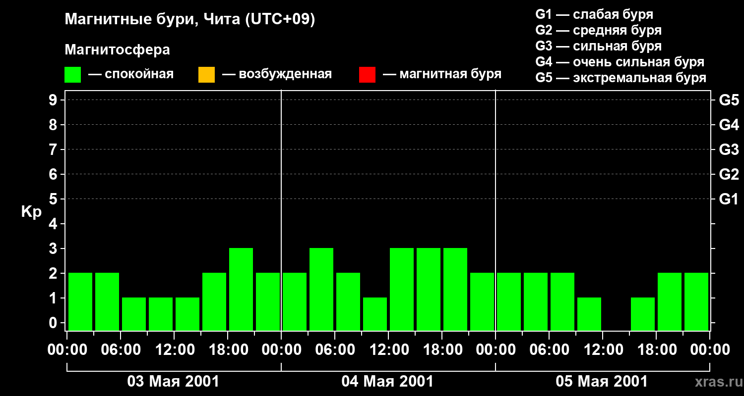 Изменения геомагнитного индекса Kp с 3 по 5 мая 2001 года для средних широт