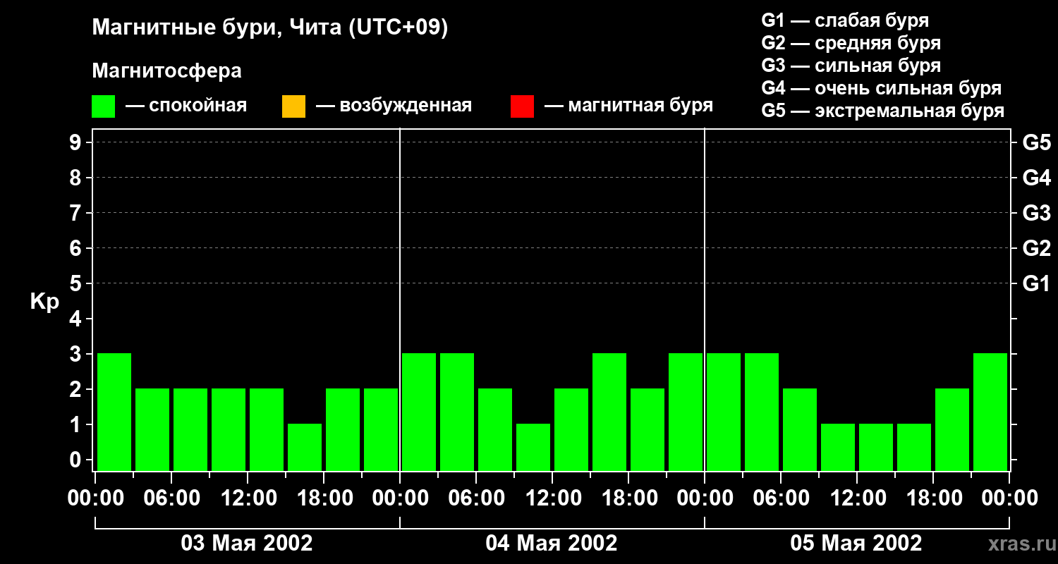 Изменения геомагнитного индекса Kp с 3 по 5 мая 2002 года для средних широт