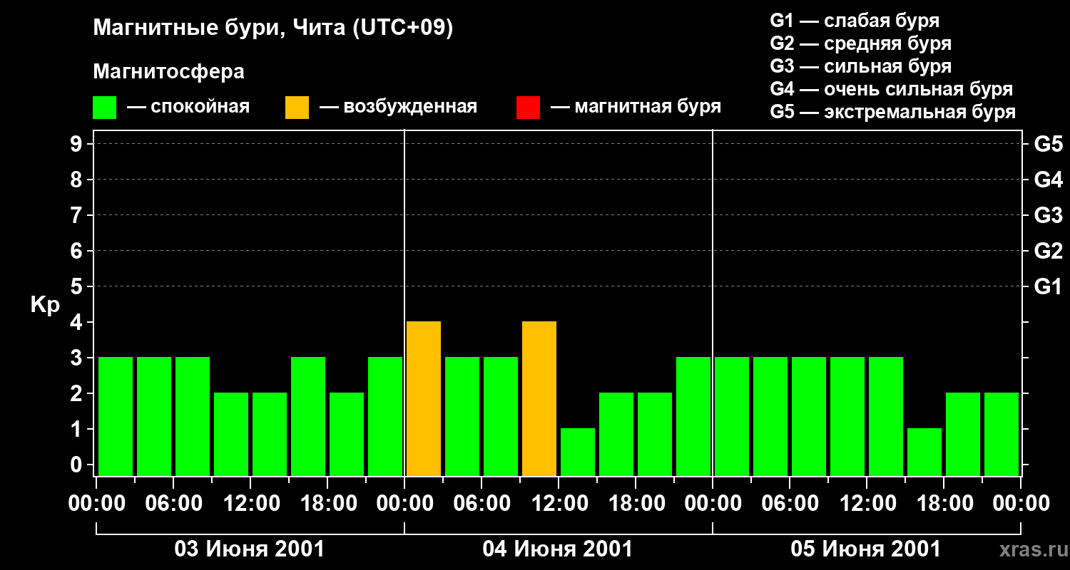 Изменения геомагнитного индекса Kp с 3 по 5 июня 2001 года для средних широт