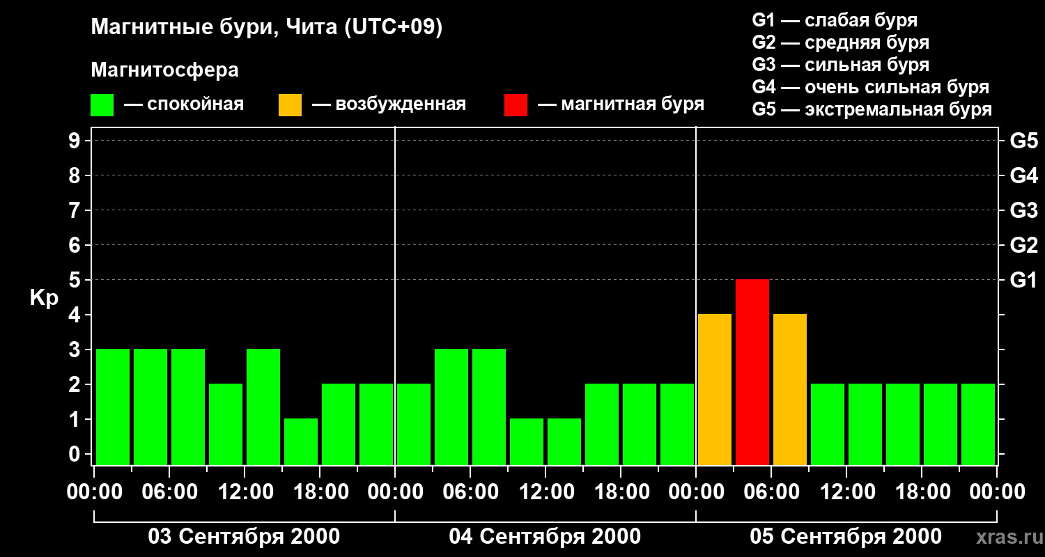 Изменения геомагнитного индекса Kp с 3 по 5 сентября 2000 года для средних широт