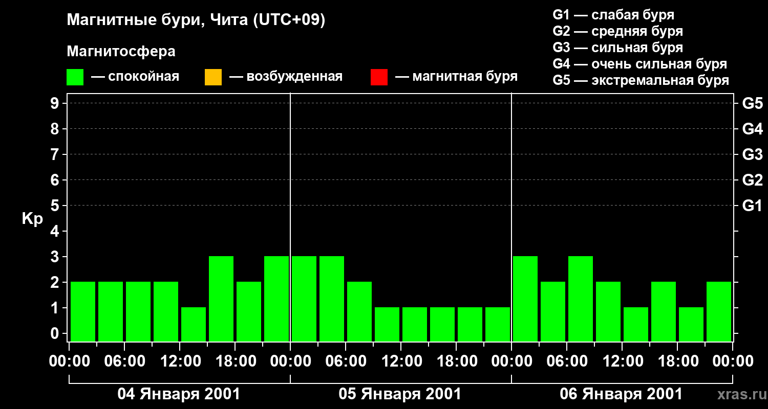 Изменения геомагнитного индекса Kp с 4 по 6 января 2001 года для средних широт