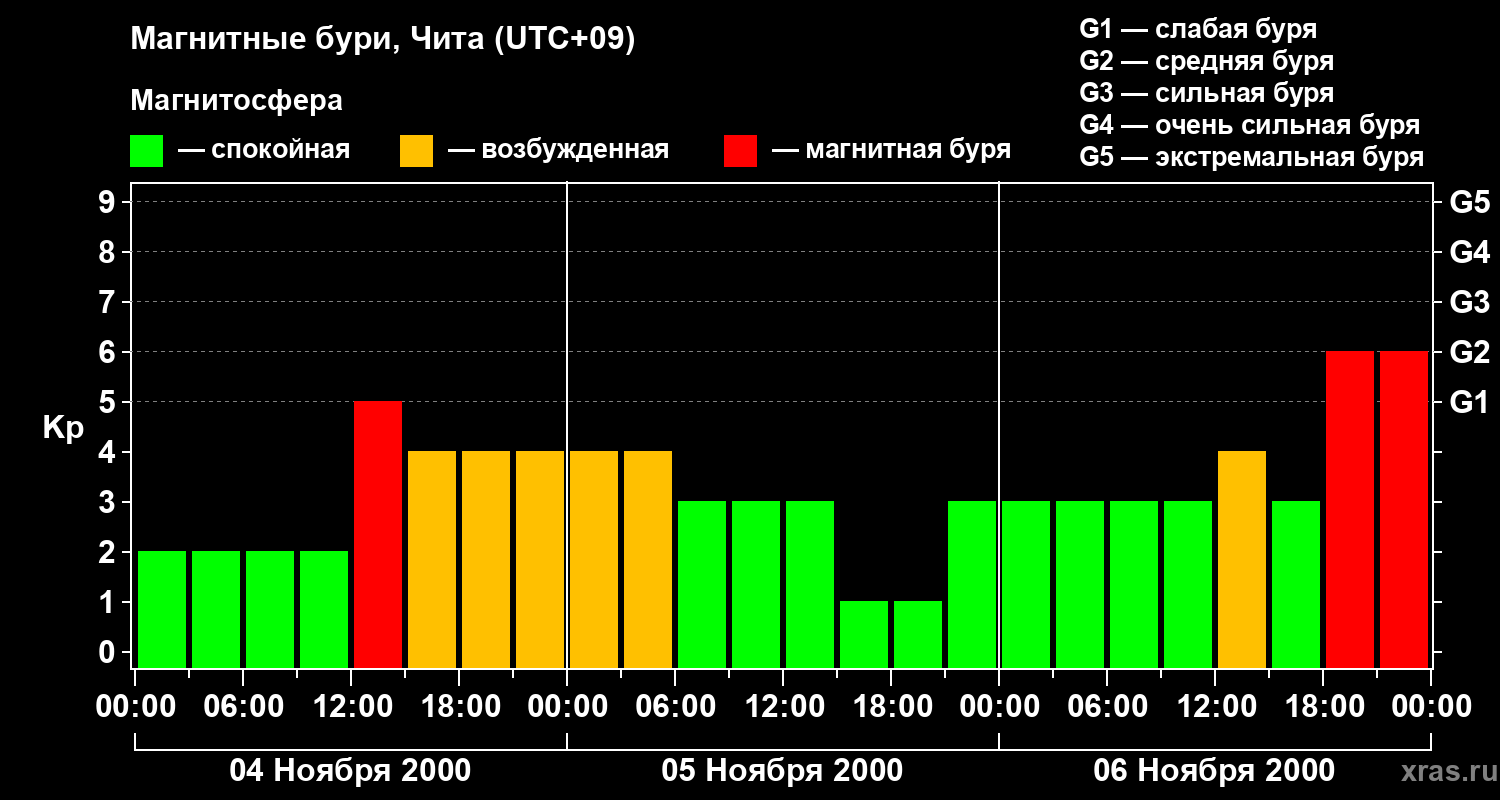 Изменения геомагнитного индекса Kp с 4 по 6 ноября 2000 года для средних широт