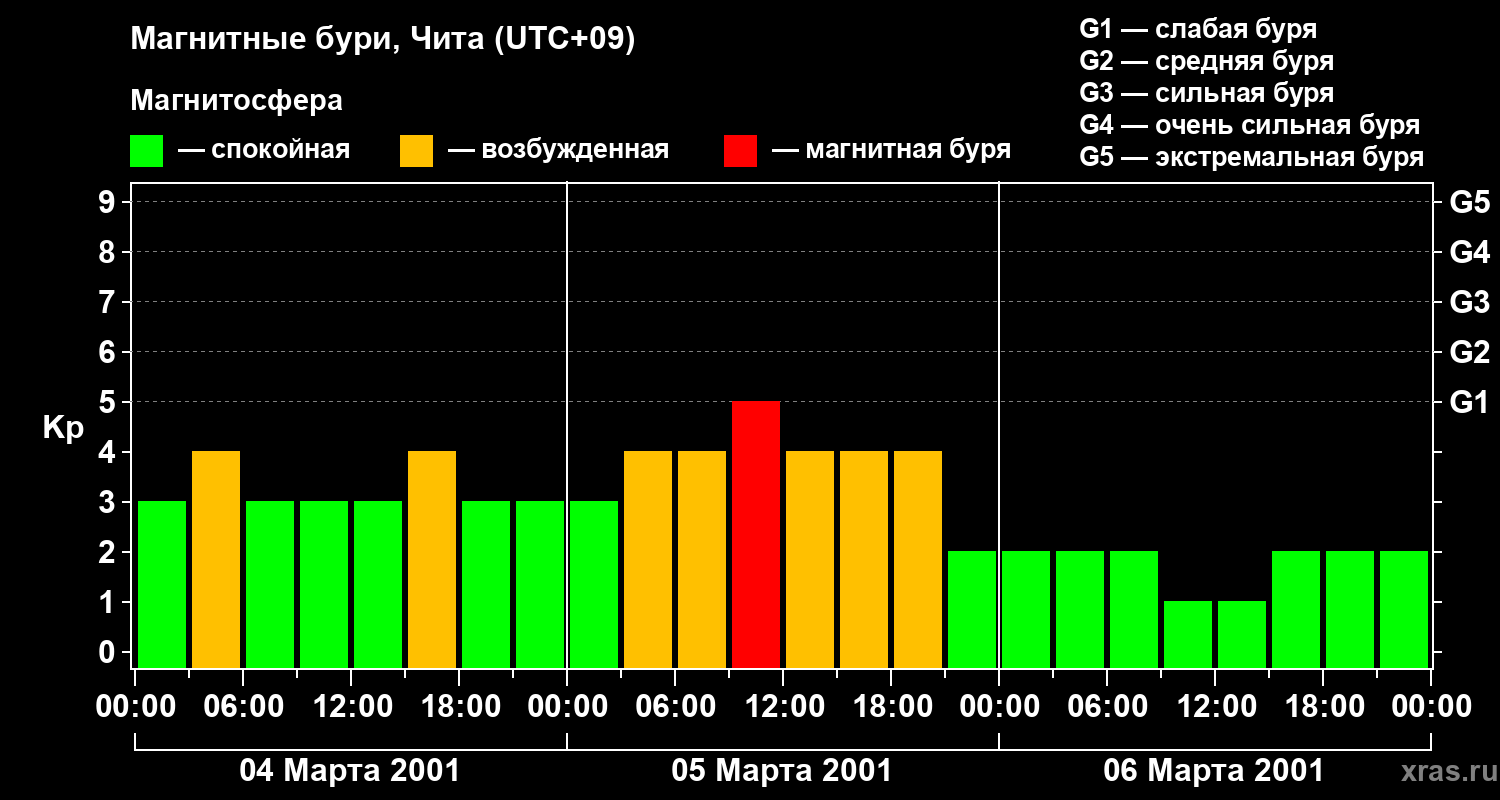 Изменения геомагнитного индекса Kp с 4 по 6 марта 2001 года для средних широт